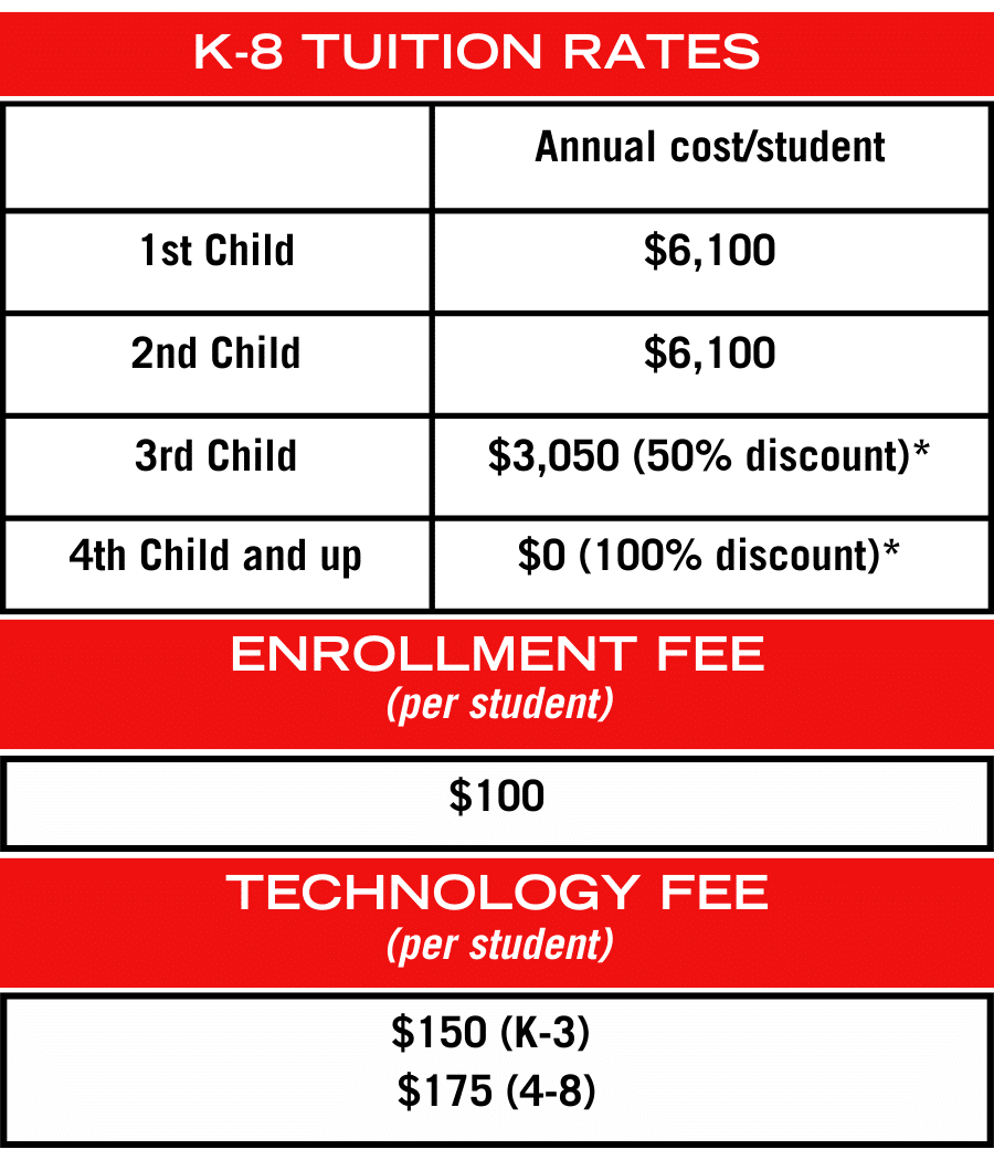 *Students enrolled in preschool may be counted toward multi-child discount. Tuition discounts will be made to K-8 tuition only. Contact [email protected] with questions.